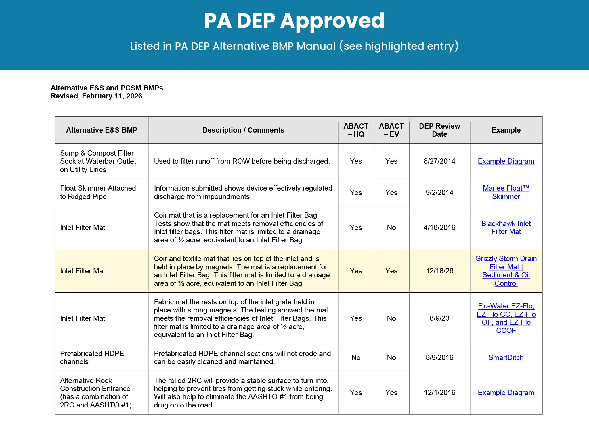 The Pennsylvania Department of Environmental Protection (DEP) periodically reviews and approves new alternative Erosion and Sediment control (E&S) Best Management Practices (BMPs) that are shown to be as effective or more effective than practices already identified in the Pennsylvania Stormwater Best Management Practices Manual.
